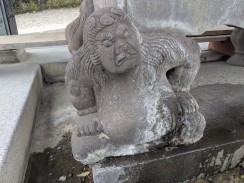 | 境内参道右側に置かれています。正面の神紋は金刀比羅系の神社で「蔭紋(かげもん)」とされる天狗の羽団扇と、三つ巴です[2]。 リアルな「がまんさま」が水盤を担いでいます。当初は後世の追加と思ったのですが、留五郎は、ほぼ同時期に同じがまん様のある北辰妙見宮(稲城市)の石水盤も作っていることから一緒に作成した思われます。 |