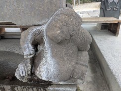 | 拝殿前に現代狛犬の手前にやや小ぶりな先代狛犬が置かれています。 登戸の石工吉沢二代目の初期の作ですが、豊かな顎髭と太い眉に初代伊勢屋藤吉から継承した特徴が伺えます。 |