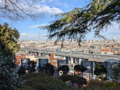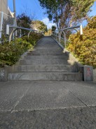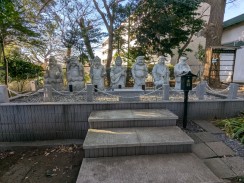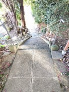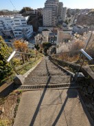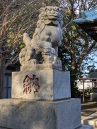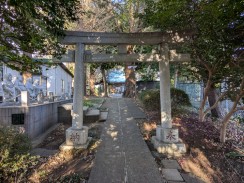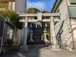 | 子母口から北に続く下末吉台地東側崖線上に神社があります。入口は南側の市民プラザ通りのある谷筋にあり、そこから急な階段参道を拝殿のある崖上まで登ります。 拝殿には消防団による7本の纏が描かれた志納絵馬が掲げられていました。同じ絵馬が千年神社と大戸神社にもあります。 東側からは、多摩川から小杉のビル群、さらにはスカイツリーまで見渡すことができました。(夜景も素晴らしいようです[3]) |