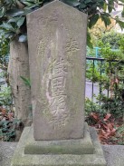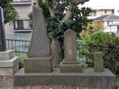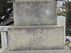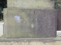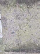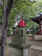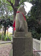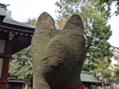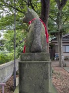 | やや上を向いた端正な顔立ちをした狛狐です。左側の足元に置かれているのは宝珠のようですが、右側の足元にある(いる)のは何でしょうか?(訪問時は子狐だと思っていましたが、今写真を見ると謎です) 玉垣に銘がある「橋本石材」は橋本安五郎の御子孫かも知れません。 |