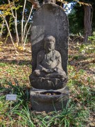| 「石造物紹介[2]」の(2)に記載された石造物です。 園内の旧府中郵便取扱所の対面で、まいまいず井戸の東側道沿いに置かれています。 観音は結加趺坐の姿勢で、三つの顔と六つの腕を持つ姿が彫り出されています。 台石の下半分が土中に埋もれているため、石工銘の下半分が確認できませんが、恐らく登戸吉澤二代目の藤三光信の作と思われます。 |