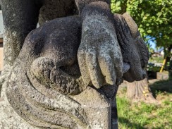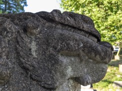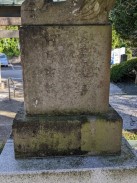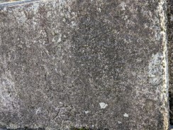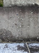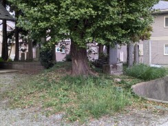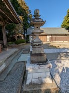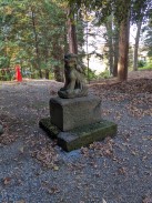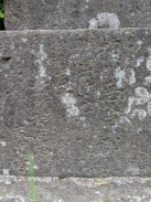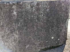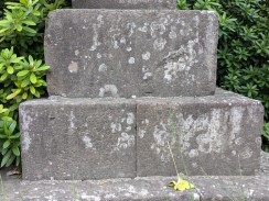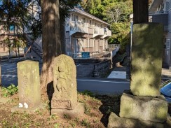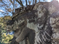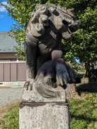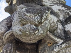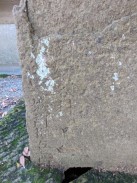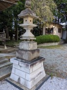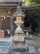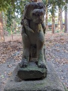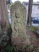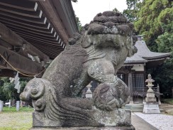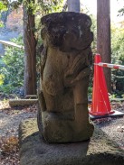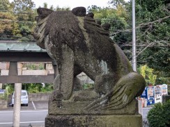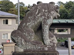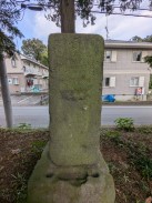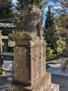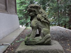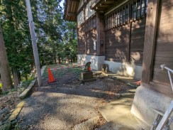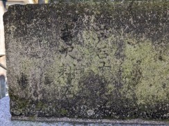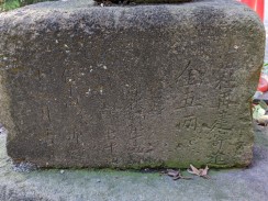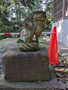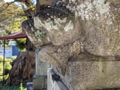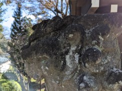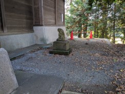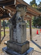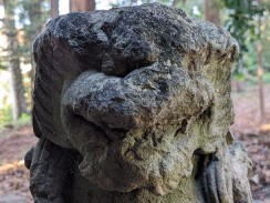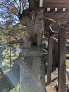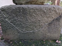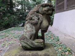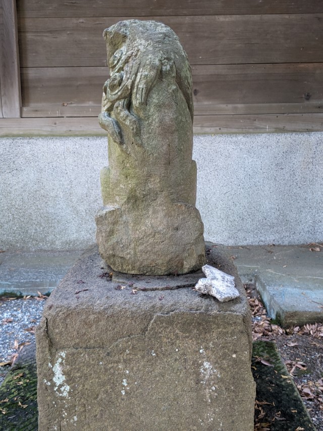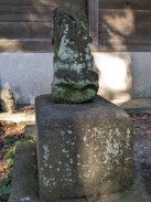 | 拝殿の左横と右横に先代の狛犬がそれぞれ拝殿の方を向いて置かれていました。 どちらも風化・欠損が著しく、左側は顔が焦げているようです。 かろうじて破損を免れている右側台座の隅に「城所権右エ門」という名が読みれるので、地神塔と同じ石工による作と思われます。 |