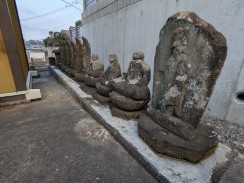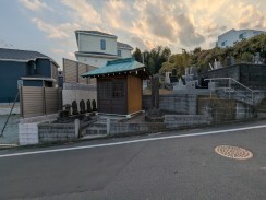 | 多摩丘陵の町田市北部で西から東へ流れる鶴見川へ北から流れてきた小野路川が合流地点の鶴見川右岸(南)側の丘陵麓に阿弥陀堂が位置しています。明治まではここから西へ丘陵を登る春日神社への参道が続いていたようです。 阿弥陀仏が安置されている堂宇の周囲に地蔵像や萬霊塔、念佛塔が並べられています。 |