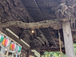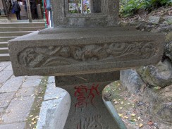 | 薬師堂前、左右に置かれている石燈籠です。傘部などに欠損が見られますが、細かく施された彫刻や、美しい文字彫を楽しむことができます。 | |