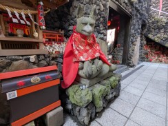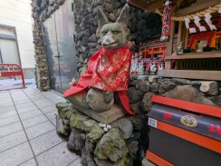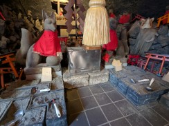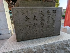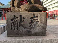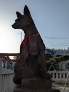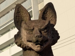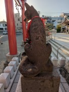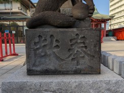 | 境内最後の鳥居脇に置かれています。多くのブログ記事で「ハンサム」「凛々しい」「眼光鋭い」と表現されている鼻筋の通った狐像です。また、大きさもあるため、迫力を感じさせます。 昭和十一年の銘もありますが、実際に作られたのは昭和三十九年の現社殿への遷座祭に合わせて奉納されたと思われます。 これだけ有名な石造物にも関わらず、石工銘の「深川 石良」に関しては情報が見つかりませんでした。 先代の狛狐が稲荷山の下に置かれていますが、こちらは烏口で、江戸の狛狐の特徴を受け継いでいたようです。 |