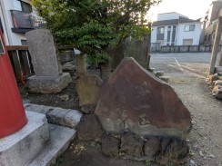 | 多摩川河口を開拓してできた新田地域に祀られた祠を発祥とする神社ですが、江戸時代から明治にかけて多くの人の信仰を集め興隆したようです。しかし、戦後の羽田空港拡張により、現在の地へ強制遷座しています[1][2]。 南側参道入口に石碑群が並べられていますが、空港内の元境内地から出土して返還されたものと思われます。 |