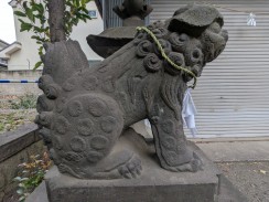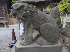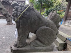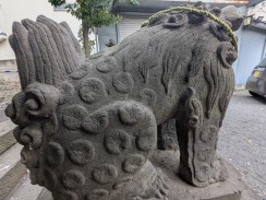 | 拝殿前に置かれている狼像です。あばら骨が表現されていることから山岳信仰系の神社でよく見られる狼のようです。 台座部分が置き換えられているため、奉納年は不明ですが、公式ページ[1]内の DigitalBook では、社殿新築(天保)以前と推測されています。 狛狐のように何か口にくわえており、また右側も宝珠のようなものを載せています。 |