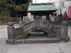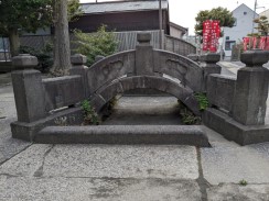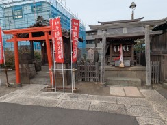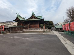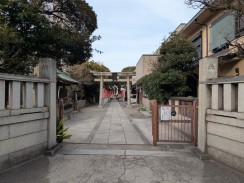 | 呑川と内川に挟まれた、かつての大森村東端に神社が位置しています。すぐ東に大森海岸があり、かつては漁業や海苔が盛んな漁村でした。そのために水の神をお祀りしたようです[1]。 境内には海苔養殖に関連する石造物が多く、運河建設で養殖組合が解散したことを記念した石燈籠や、海苔販売会社が組織した海盛講が奉納した石碑、戦後に海苔養殖(漁業権)を放棄したことを記した「漁業納畢(のうひつ)之碑」などが残されています[4][5]。 ※「舩」は「船」の異体字です。 |