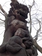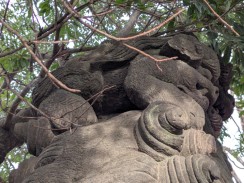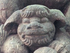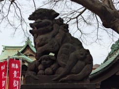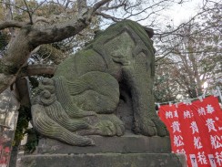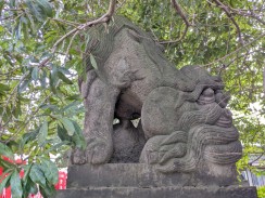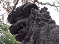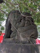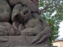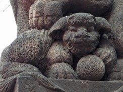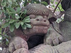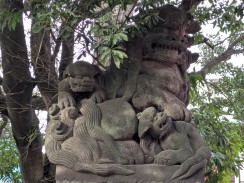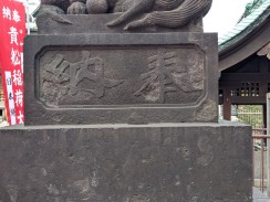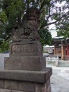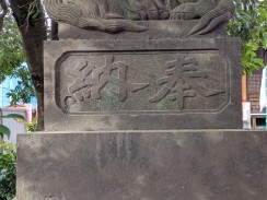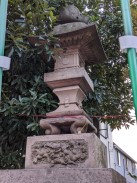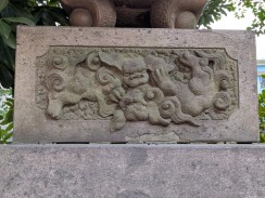| 参道左側の最も入口側に置かれており、対となる右側の燈籠はありません。 石工は狛犬と同じ竹内六之助で、レリーフの狛犬もなんとなく似ています。 |