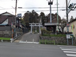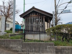 | 多摩川に向かって北上する乞田川に沿って鎌倉街道が通っていますが、街道の西側丘陵斜面に神社が置かれています。 かつては街道関が置かれた場所で、参道脇には木戸柵が再現されていました。 地蔵堂裏にある庚申文字塔は、地蔵坐像と同じ寛政八年の作ですが、台石部分に「弎匹𤠔」と書くことで三匹の猿を表している珍しいものです[2](「弎」は「参」の、「𤠔」は「猿」の異体字)。 |