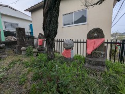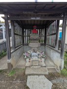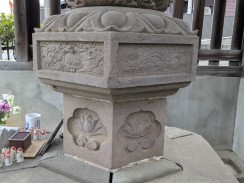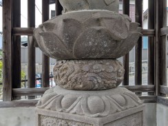 | 現在は神社鳥居前に地蔵堂のみ残されていますが、かつては神社別当寺であった熊慶寺(廃寺)にゆかりの地蔵像だったようです。 台座の細かい彫りがよく残っており、江戸の腕の良い石工が作ったことが伺えます。 「松屋町」は現在の中央区八丁堀三丁目で[3]、江戸時代は石工職人も住んでいたようです。 多摩市の調査資料によれば、現在は埋もれている台座の正面部分に奉納年銘があるそうです。 |
