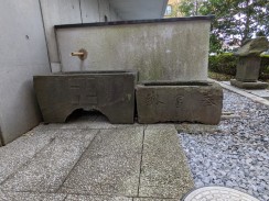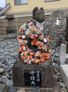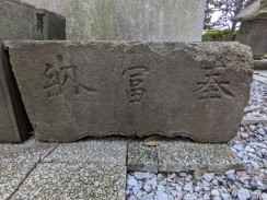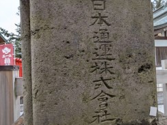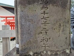 | 左側の台石裏側に奉納者として「日本通運株式会社」と彫られています。いわゆる「日通」は昭和十二年に国営会社として設立されているので、その五年目の奉納となります。千代田区の日通本社ビル敷地内にも稲荷神社がお祀りされている[2]ようなので、何らかの縁があるようです。 | |