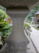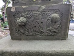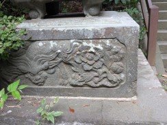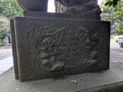 | 拝殿のある境内へ登る石段下の左右に置かれています。猫足で傘が立派な石燈籠ですが、台石に施された彫刻も見事です。 石工の秋元幸太郎は舞岡八幡宮の石燈籠も手がけています。 |