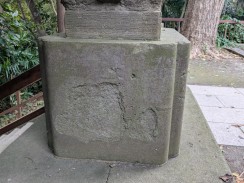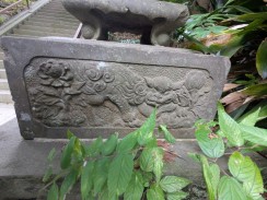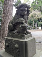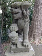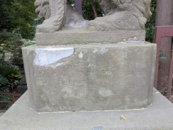 | 拝殿のある境内へ登る階段を上がった所の左右に狛犬が置かれています。左右ともに口が開いていて、迫力ある表情をしておられます。台座正面に、花と奉/納の文字がレリーフのように浮き彫られているのが目を引きます。 | |