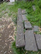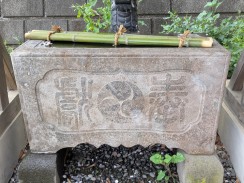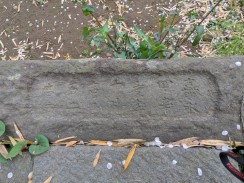 | 上記残材と同じく天満宮社境内に置かれています。奥の鳥居脚らしき石材に「明治」とのみ確認できますが、それ以外の銘は確認できませんでした。 北村氏の「鶴見村石工・飯島吉六 ~十一代続いた石工~(謝辞[1])」によれば、先代の鳥居(明治十二年)には「九代目 飯島吉六」という石工銘があったとされています。 |