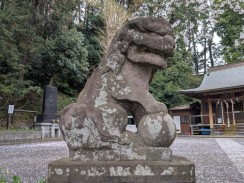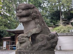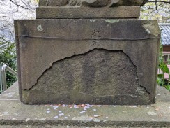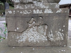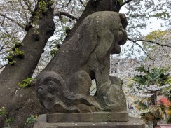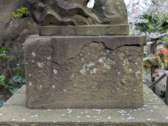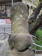 | 頭部の大きさと脚の細さがアンバランスです。ただ、阿側子狛は長い毛を持ち不思議な印象を残します。台座に「紀元」が残っているので、紀元2600年=昭和15年頃と思われます。 | |