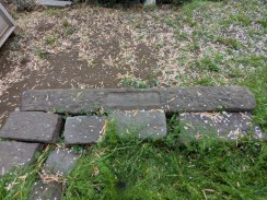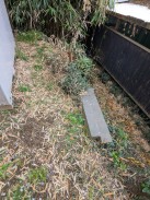 | 天満宮社の右横に置かれている残欠群の、一番手前の石材に吉六の銘が残されています。横長の石材ということもあり、鳥居や幟立てとは考えられず、何の残材なのかよくわかりません(社殿基壇の積込石?)。鶴見の飯島吉六(年代的に八代目)の作と思われます。 北村氏の資料({謝辞[1][2]})にも記載が無く謎の作品です。 |