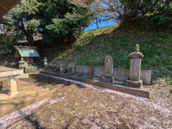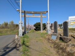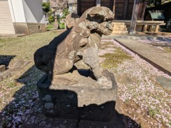 | 横浜市の西境界線上を南へ流れる境川の左岸(横浜側)丘陵斜面に神社があります。 鳥居と境内の間が 100mほど離れていて、その間は一般道路となっていますが、説明板によれば、かつての鎌倉街道だったようです。 拝殿前に狛犬が三対あり、その中の現代狛犬二対の奉納年が近いのは、分社にあったものが本社に移設されたためのようです[2]。 |