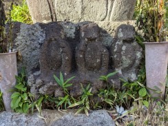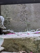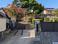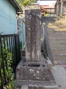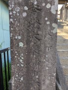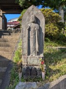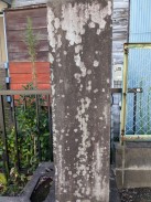 | 入口駐車場から山門へ上がる階段の左横に置かれています。正面に「大乗妙典六十六郶供養」とあり、右面に奉納年銘が彫られています。石工銘は台石左側面にあり、隣家との隙間がなく見づらいです。 | |